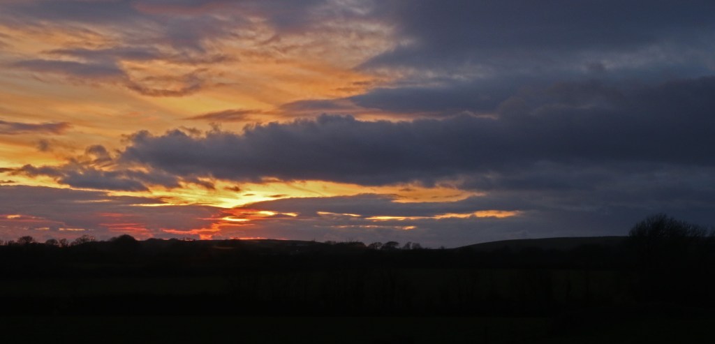 Monday 6th. The field behind us was sowed with spring barley yesterday, keeping a few gulls and corvids interested, as well as the wagtail flock that held at least 5 white wagtails and a Meadow Pipit; the first here since January and maybe a sign that some migration is in the air. That was certainly evident in a visit by my old birding mate Trevor Wyatt, who accompanied us on trips to Spain, Austria, Czechoslovakia, Israel and Turkey during the 1970s and 1980s. He travelled down from London by train and although we only had time for lunch in Potter’s Café in Dorchester and a visit to our cottage it was a very enjoyable three hours and the day was capped off nicely by a beautiful sunset …..